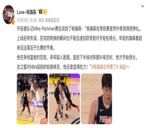 在这样的情况下,球迷一方面担心杨瀚森会不会被下放到发展联盟,另外一方面也在质疑杨瀚森这段时间到底有没有在努力付出和训练。在本场比赛结束后,我们看到开拓者球队的记者也在个人博客上面点评了这位年轻菜鸟的表现,言语之间其实是难掩失望的。
