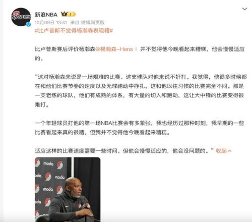 而对于小杨这一次非常一般的表现,开拓者球队的主教练在赛后也说出了自己的心里话。他认为杨瀚森表现并不算糟糕,因为教练在他的身上看到了自己当年的影子,作为一名新人难免会犯各种错误。但很显然比卢普斯在之前的训练当中看到了杨瀚森身上的天赋,所以他对这一名年轻的中国球员非常有信心,才会给予他足够多的出场时间和耐心。所以作为中国球迷,我们也不妨多给杨瀚森一些时间,相信他会不断的升级打怪,将来会给所有喜欢他的球迷一个惊喜。接下来很快杨瀚森将会在球队的主场迎战另外一个对手,期待他能够打出更好的成绩和数据。