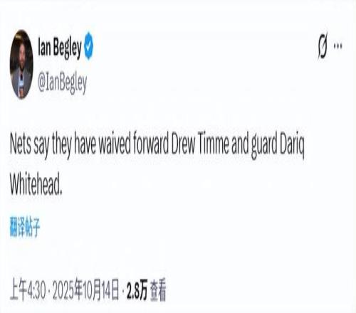 北京时间10月14日,篮网队官方宣布,球队已裁掉达里克-怀特黑德和德鲁-蒂米。球队已经在社媒上对两人致谢。