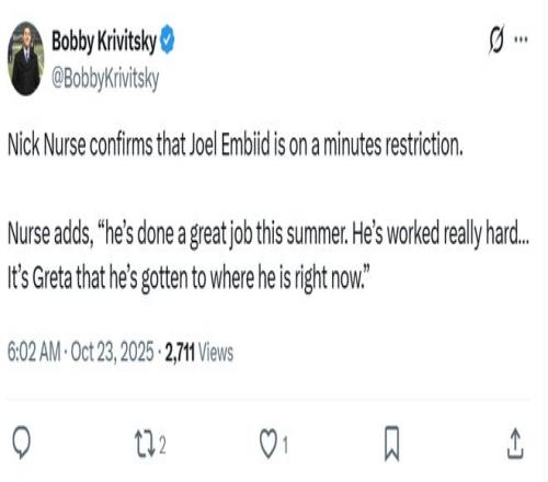 一年狂赚6500万美元,结果恩比德复出首秀9中1完全迷失!常规赛首战连送迷惑操作遭群嘲,美媒直言他的膝盖已经废掉了。