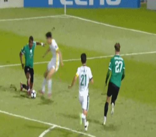 第26分钟,张源禁区内踢倒特梅尔科夫斯基,主裁判判罚点球,特梅尔科夫斯基主罚点球右脚劲射中路破门,2比0!