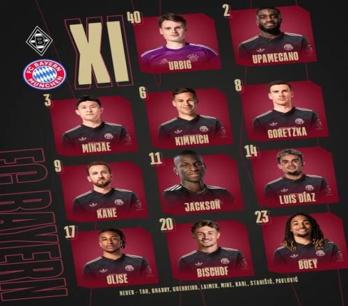 德甲第8轮,拜仁慕尼黑客战门兴格拉德巴赫,赛前拜仁首发阵容已经出炉,具体名单如下: 拜仁首发:乌尔比希 / 基米希、于帕梅卡诺、金玟哉、博埃 / 戈雷茨卡、比朔夫 / 奥利塞、凯恩、路易斯·迪亚斯 / 尼古拉斯·杰克逊