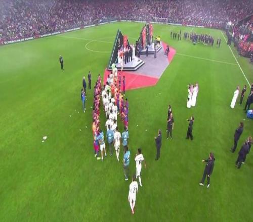 众所周知,一般杯赛决赛中,将先给亚军颁奖,而巴萨在皇马球员领奖时,非常有风度列队鼓掌致敬,而当冠军巴萨球员走上领奖台时,皇马群星却消失了。