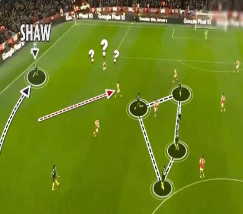 曼联边卫卢克·肖和迪奥古·达洛在外侧跑位,迫使阿森纳边锋不得不跟人,这样的牵制,让红魔中场始终多出一人。