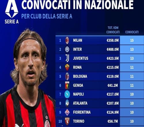 10月国际比赛日意甲球队被征召人数:米兰15人,国米尤文13人