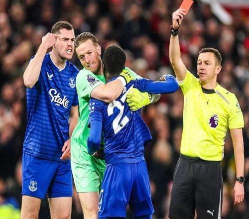 北京时间11月25日英格兰足球顶级联赛第12轮,曼联主场对阵埃弗顿。上半场,盖伊怒扇队友基恩被直红罚下。随后,霍尔兜射入死角,帮助太妃糖取得领先。下半场,皮克福德屡次贡献神勇扑